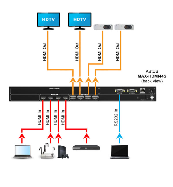 The MAX-HDMI44S is a professional 4x4 HDMI 1.4 Seamless Matrix Switcher with EDID management. It includes 4 HDMI inputs, 4 HDMI outputs. The matrix switcher features comprehensive EDID management to ensure maximum functionality with a wide range of video sources. The matrix switcher supports RS-232 control options.