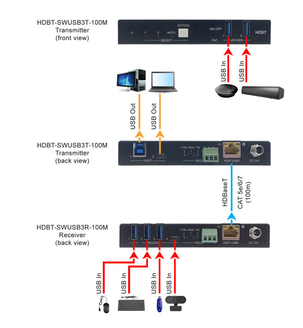 The 100M USB 3.2 Gen 1 extender is designed to transmit USB signal up to 100m distance. HDBT-SWUSB3T-100M is the host port of the extender, it contains one Type-B and one Type-C for PC or laptop connect. It also has two local USB-A port with 5V500mA power supply for speakerphone and headset. The extender also supports bi-directional 24V PoC power.