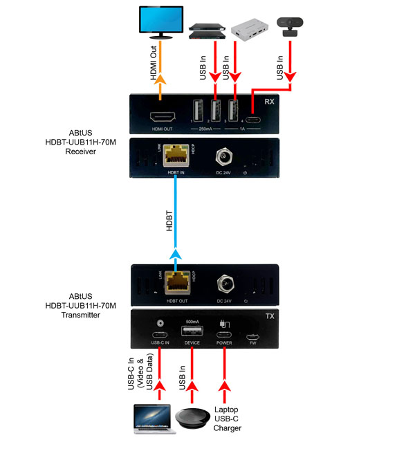 The ABtUS HDBT-UUB11H-70M is an USB-C To HDMI HDBaseT Extender which allows high definition video to be transmitted over distances of up to 40m at 4K@60Hz and 70m at 4K@30Hz via CAT6A cable.